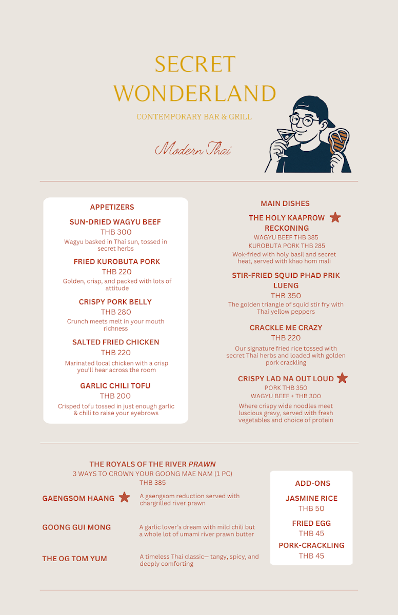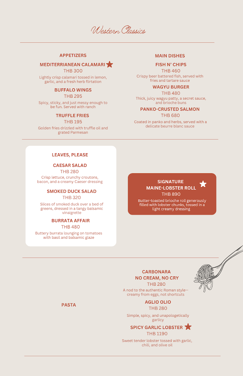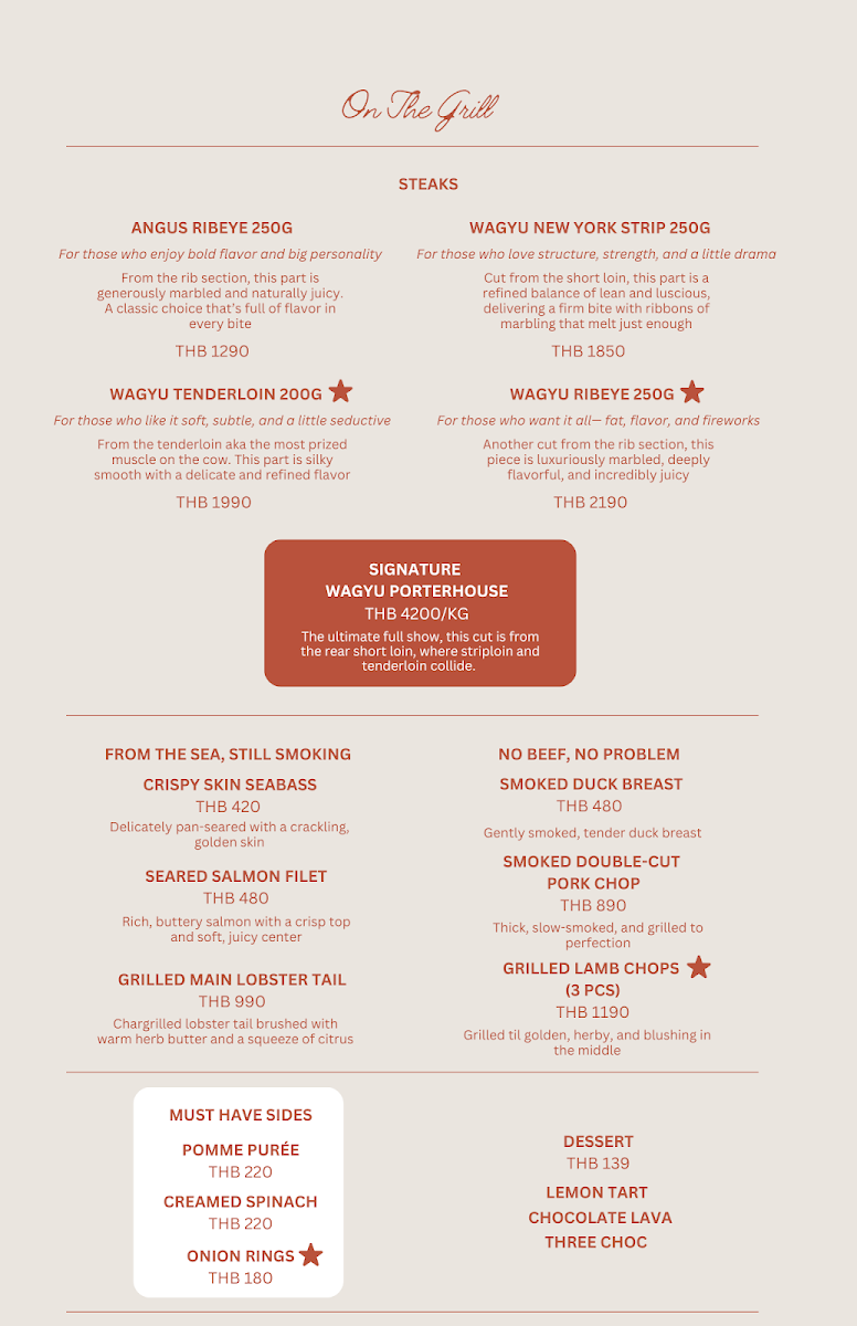 - Main Courses: A variety of dishes including Thai specialties, grilled items, and pasta, providing options for both local and international tastes.